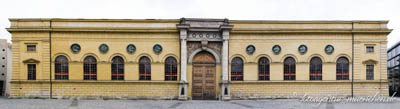 Der Bau mit dem monumentalen Rundbogenportal, bekrönt mit Büsten von Kastor und Pollux, gilt als eines der reifsten Frühwerke Klenzes. Der Plastische Schmuck, acht runden Bronzereliefs mit Pferdeköpfen, zwischen den Fensterarchivolten und die Steinreliefs Kampf der Zentauren und Lapithen in den Portalzwickeln sind Werke Johann Martin von Wagners.