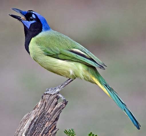 Bildrechte: Green_Jay_near_Roma,_Texas.jpg: Alan WIlson derivative work: Toter Alter Mann (talk), Cyanocorax luxuosus calling, CC BY-SA 3.0