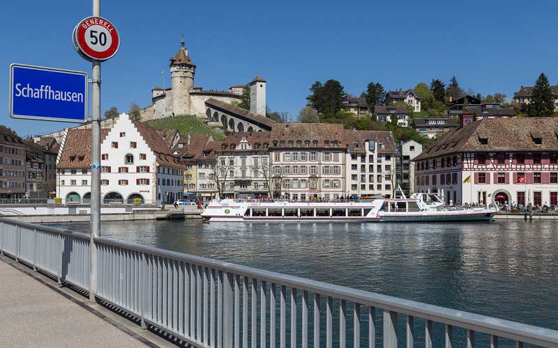 Bildrechte: JoachimKohlerBremen, Schaffhausen mit Munot, Rhein & MS Munot 20150419-IMG 0194, CC BY-SA 4.0
